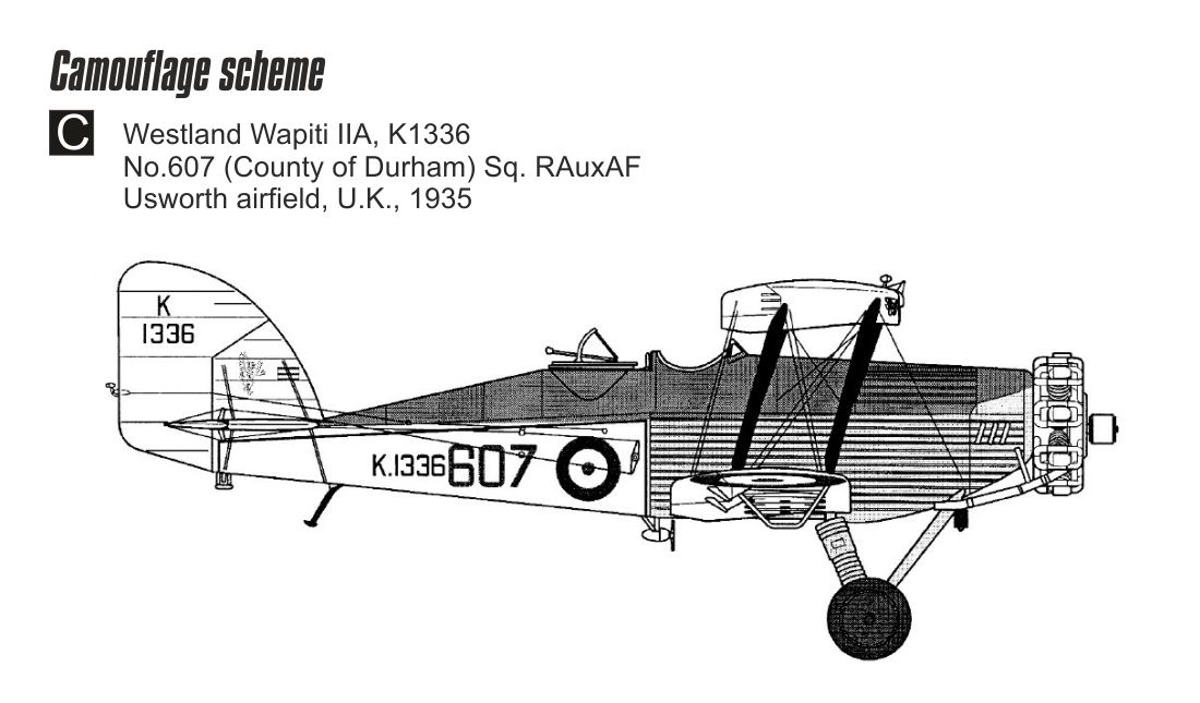 3)   Westland Wapiti Mk.IIA, K1336, 607. peruť (County of Durham), Královské pomocné letectvo (RAuxAF), letiště Usworth, Durham, Velká Británie, 1935